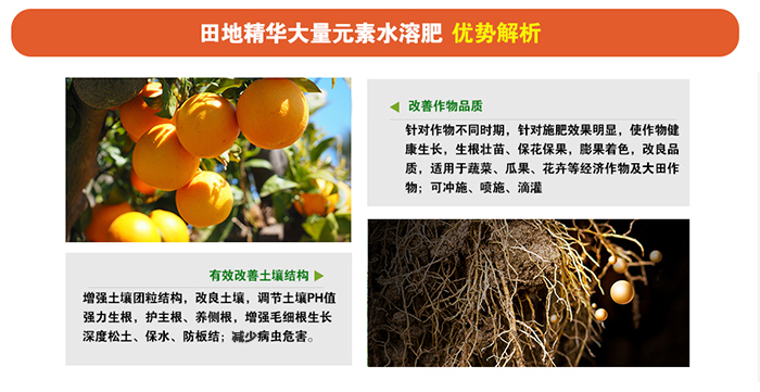 田地精華大量元素水溶肥料采用磷酸二氫鉀或礦源黃腐酸鉀為原料,特別添加海藻酸與螯合微量元素,根據(jù)作物生長階段所需營養(yǎng)設(shè)計(jì)配方,適合多種施肥方式,省時(shí)省力。